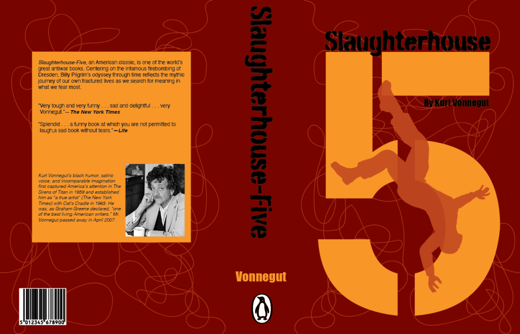 Slaughterhouse Five is one of my very favorite books. When a project came along to recreate a book cover, I jumped at the chance to give this book a makeover. The scribble shape in the background mimics Kurt Vonnegut’s own loose illustration style, while the falling soldier figure pays homage to the book’s main character. The color palette is attention-grabbing, with deep reds and bright, almost jarring orange. The font is a military-style font, again drawing attention to the book’s subject and main character. The font of the author listing is in a complementary style to the title, allowing the smaller text to be more easily read.
