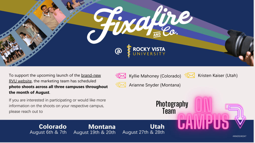 Rocky Vista University partnered with Fixafire Photography to build a professional photo bank in preparation for the launch of a new University website. To ensure broad participation, the Marketing team needed a way to inform students, faculty, and staff across all three campuses (Colorado, Utah, and Montana) about the scheduled photoshoots and how to get involved.