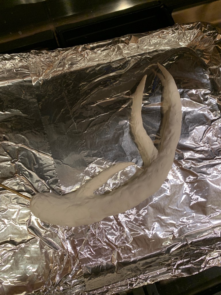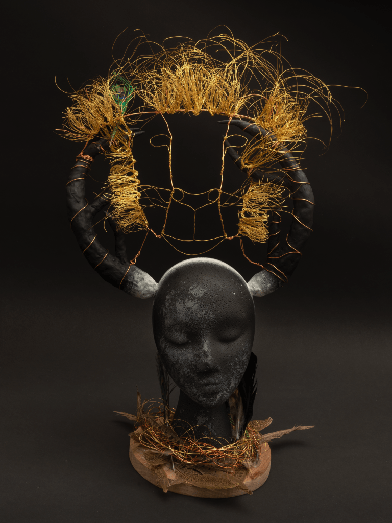 I created this sculpture in 2019 as an experiment in 3D design. The goal was to create something personal to me, which makes this sculpture a particular favorite of mine. I have always loved mythology, particularly Greek and Roman mythology. Artemis (or Diana) is the Greek (or Roman) goddess of the moon & the hunt. Her symbols include the new moon, and a majestic deer. I painted a mannequin head to resemble a new moon, and used shades of dark grey to give the black some texture. I used clay wrapped around wire to create two deer antlers, which I attached to the mannequin head with epoxy.