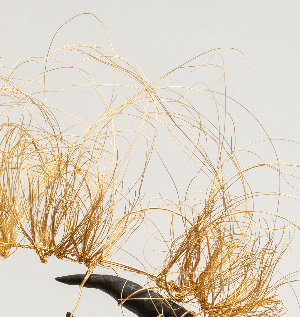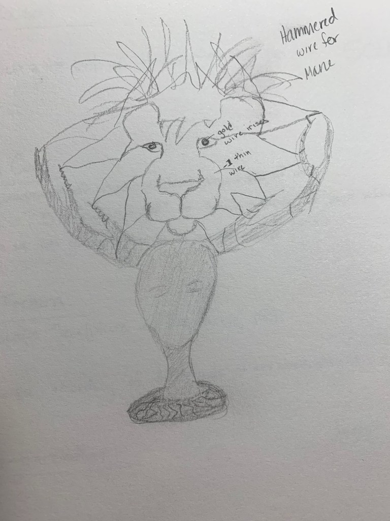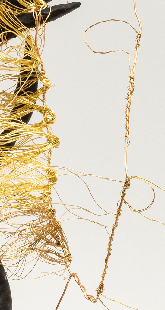 After the antlers were firmly attached, I painted them black to blend with the head. Using the antlers as support, I carefully wrapped wire and shaped it into the head of a lion. The mane of the line was created by wrapping short bundles of wire around the central from of the line head. Once attached, I was able to fan them out and give them more of a hair-like feel.