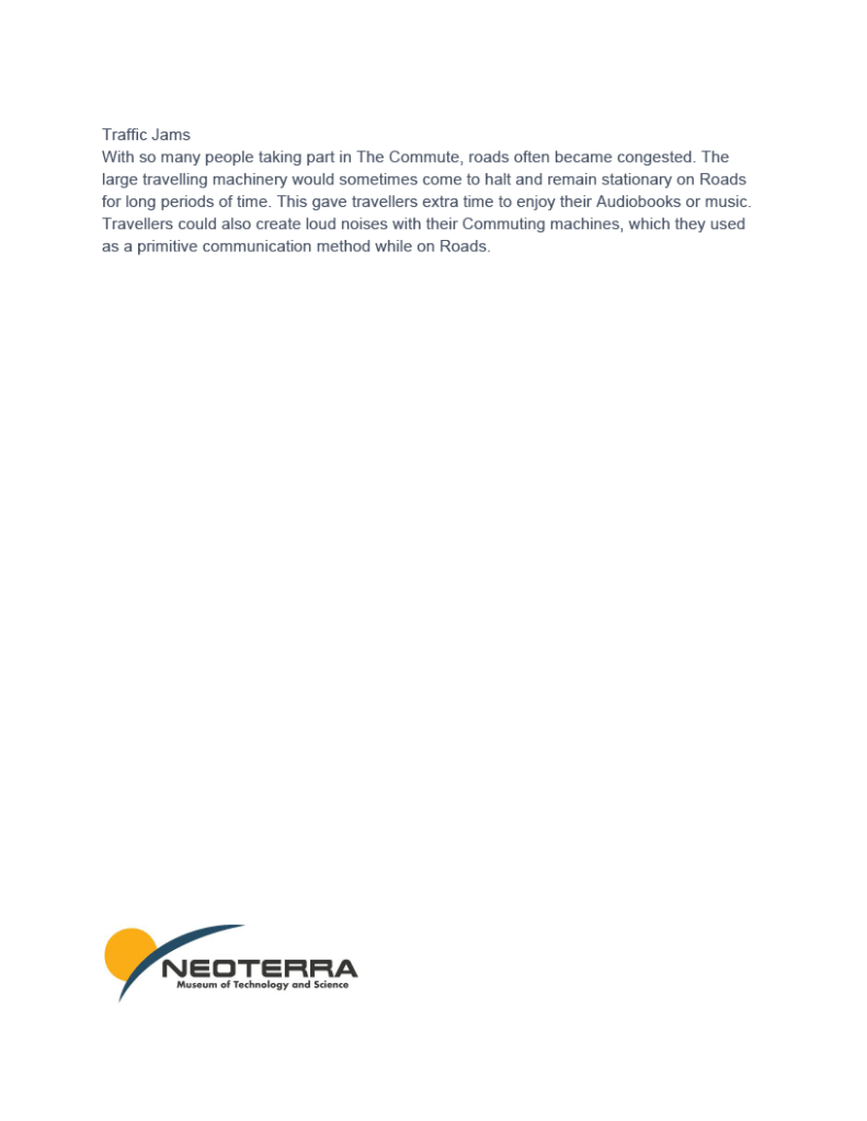 I began this assignment by creating the museum of the future and building their mission statement, a logo and color scheme, and a museum persona. Then, I quickly narrowed down what elements I wanted to discuss about the daily commute, and created a script. Once I developed the text I wanted to include, I created the display itself, sticking to the museum color scheme. I included images that were context-appropriate and then arranged them in the final composition.